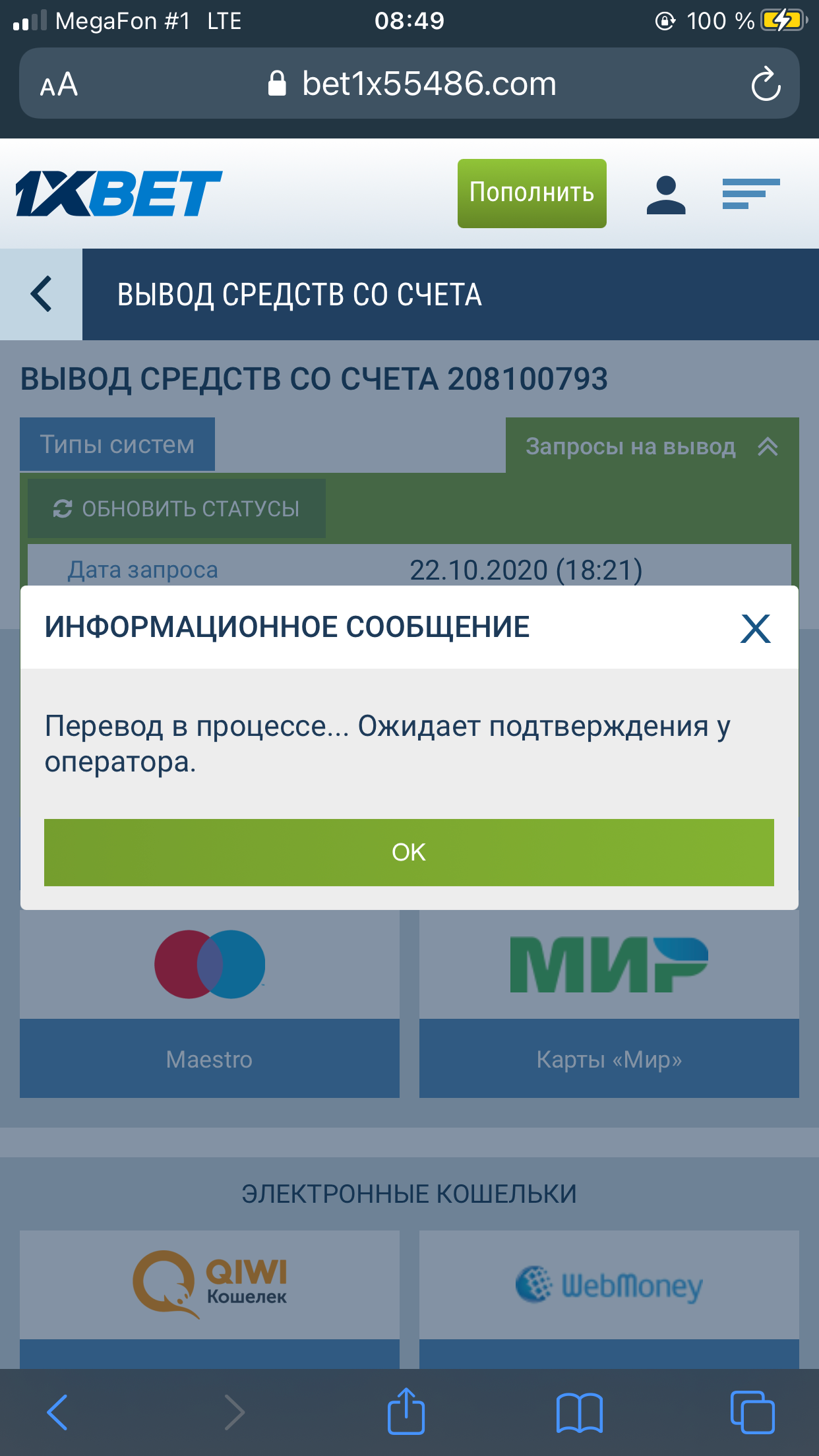 « Перевод в процессе... Ожидает подтверждения у оператора.»