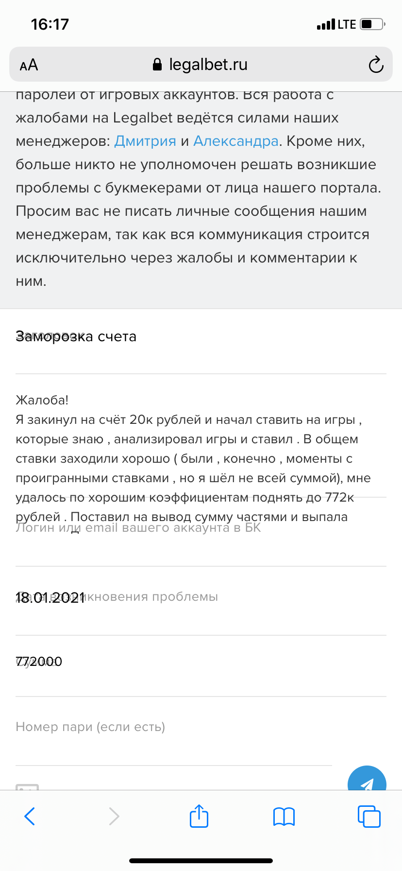 Я закинул на счёт 20к рублей и начал ставить на игры , которые знаю , анализировал игры и ставил . В общем ставки заходили хорошо ( были , конечно , моменты с проигранными ставками , но я шёл не всей суммой), мне удалось по хорошим коэффициентам поднять до 772к рублей . Поставил на вывод сумму частями и выпала отмена . Позвонил поддержке , сказали , что рассмотрят ситуацию и ответят на почту . Позвонил им сам , они назначили конференцию . Прошёл конференцию в скайпе и сказали ждать . Но так никто и не связывался со мной , я сам им звонил и каждый раз они говорили , чтобы я ждал и ждал . Сейчас уже сказали ждать аж до 30 дней , будет проводиться более детальная проверка . Вроде , сказали , что подозрительная активность на аккаунте . На счету играл я , никому не передавал и доступа никто не имел и иметь не мог. Мне хотелось бы , чтобы данный букмекер вернул мне мой счёт со всеми выигранными средствами , так как оснований иных у них нет . . Мой имэйл аккаунта dala71717171@icloud.com