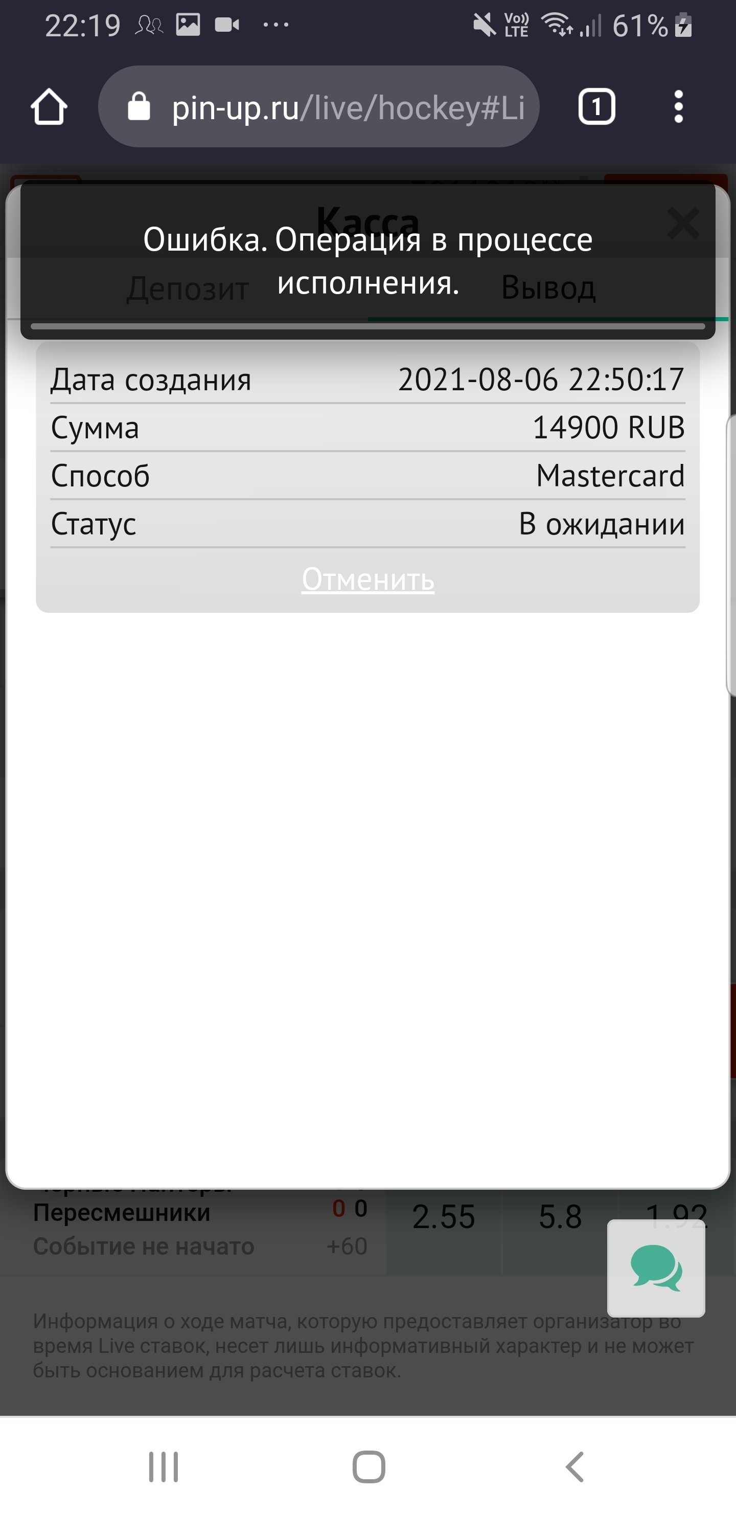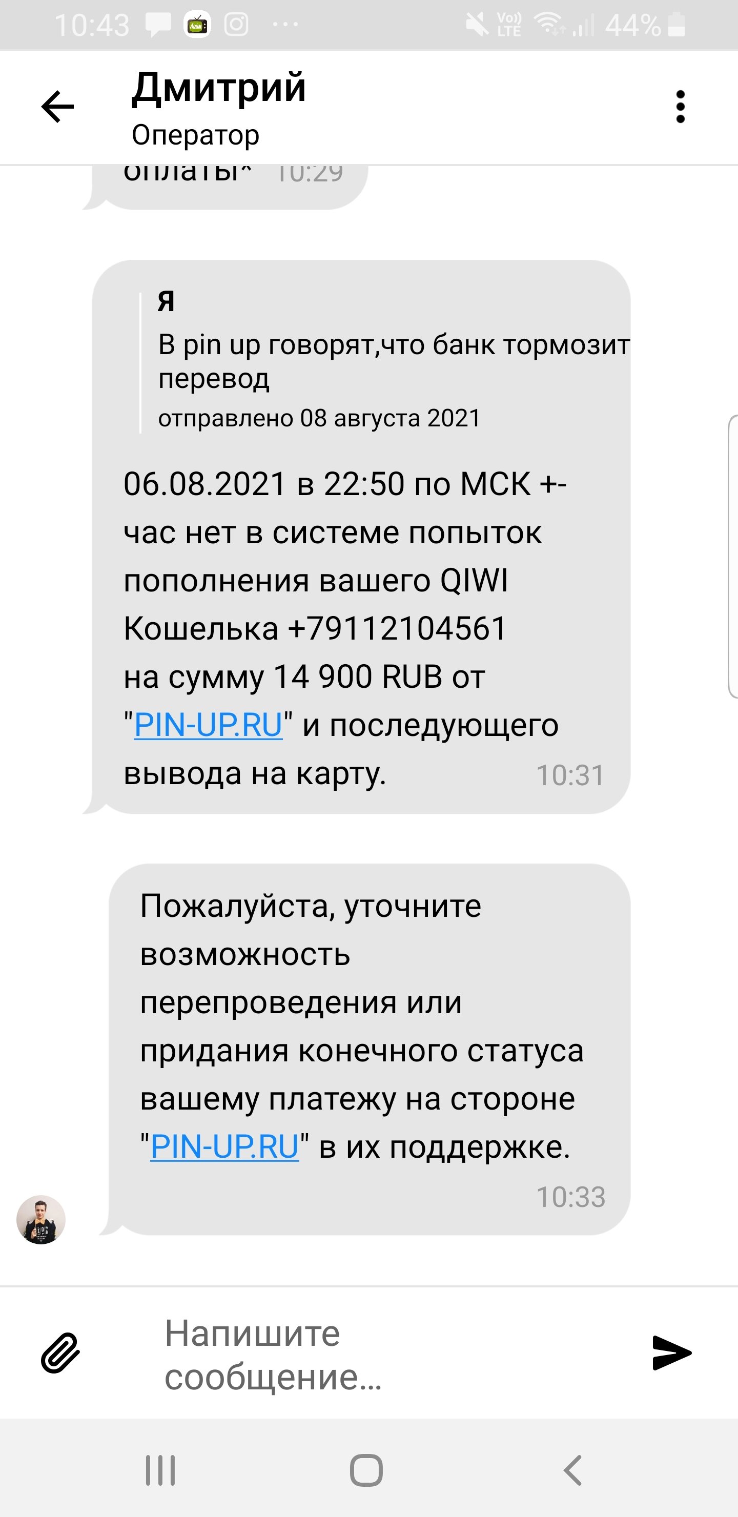 Pin-up заморлзил транзакцию и не дает вывести выигрыш