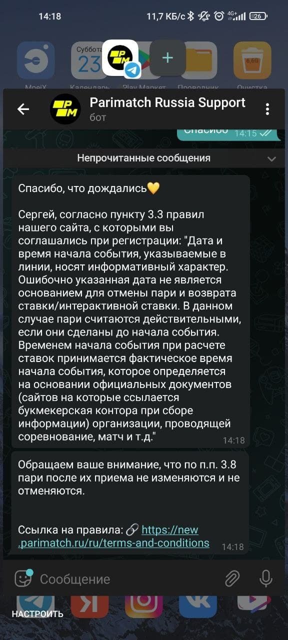Он написал в поддержку и ему ответили что Скрин ниже. Париматч честно поступил по отношению с клиентом?