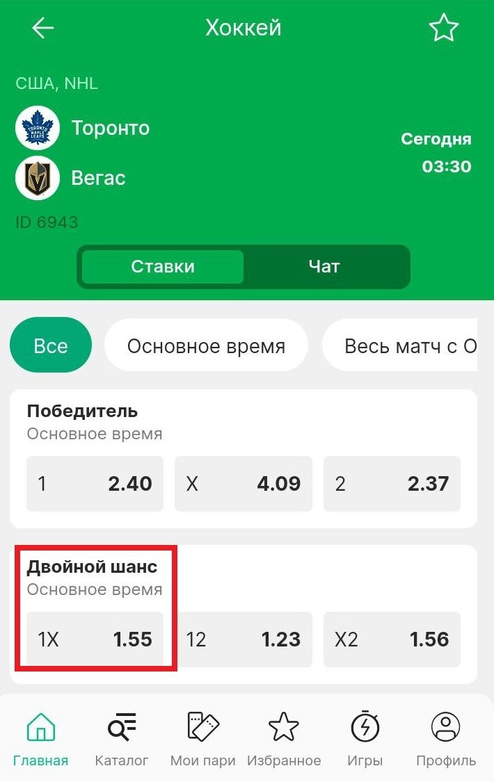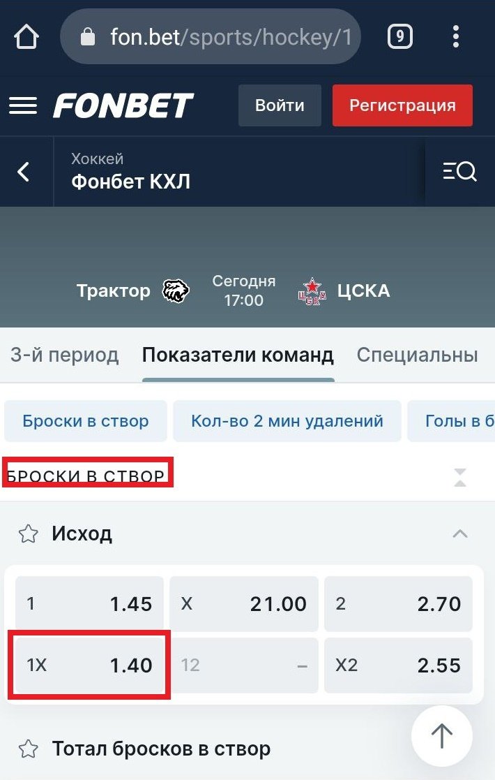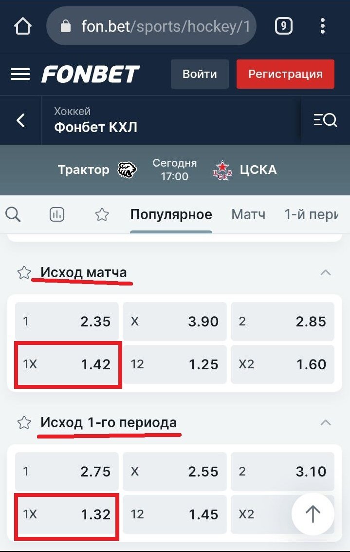 Например, вы можете поставить на непроигрыш челябинского «Трактора» в матче КХЛ против ЦСКА за 1.42. Или заключить пари 1X с кэфом 1.32 только на первый период этой встречи.