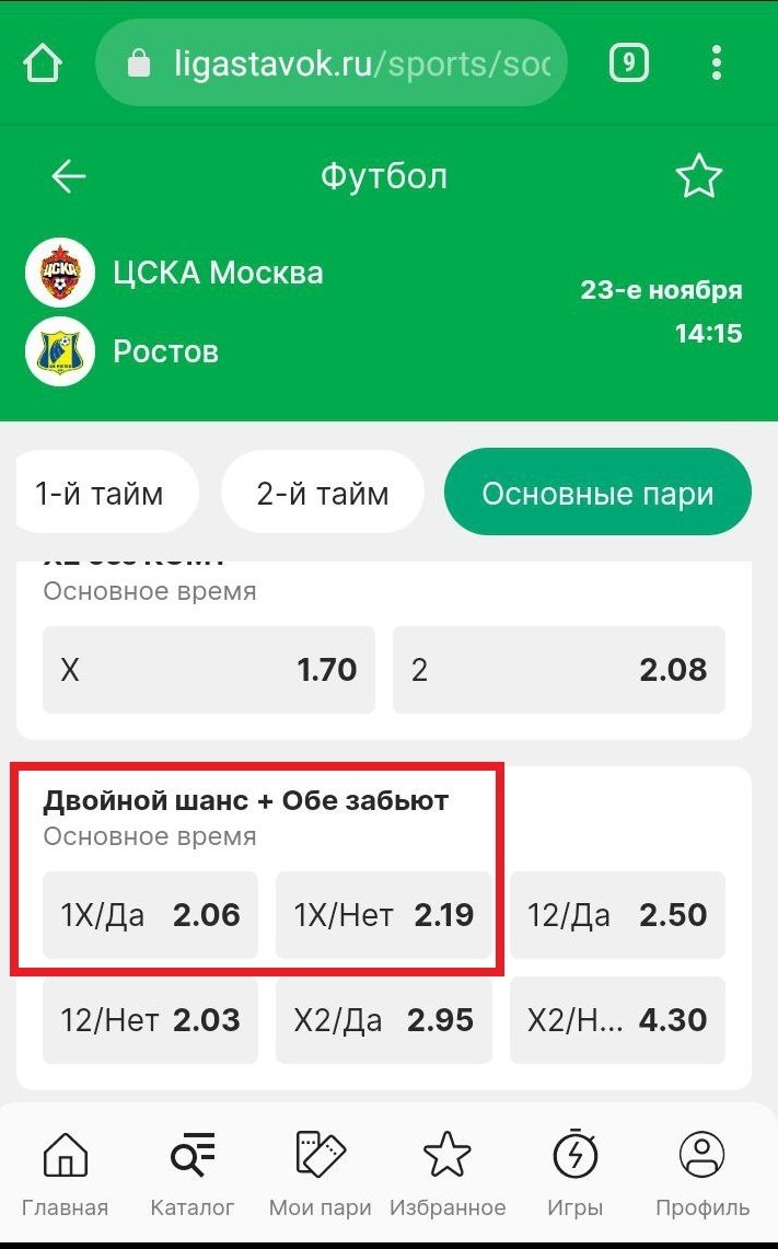 Возьмём для примера матч РПЛ ЦСКА — «Ростов». БК «Фонбет» предлагает на двойной исход коэффициент 1.19. Победа ЦСКА с форой (0) оценивается более высоко — 1.32.