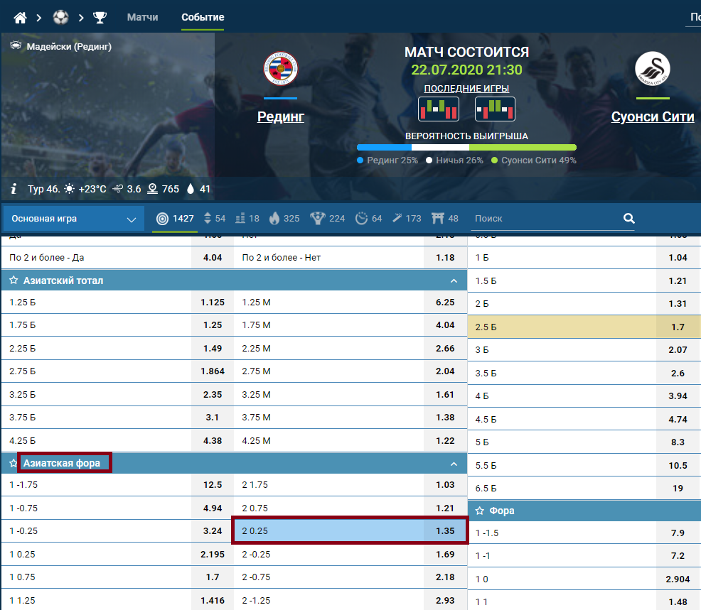 Рассмотрим, как работает азиатская фора, на примере футбольного матча между командами «Рединг» и «Суонси Сити».
