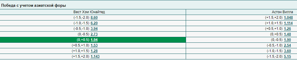 Рассмотрим еще один пример для ставки Ф1(+0.25). Это матч между «Вест Хэм Юнайтед» и «Астон Виллой», где первая команда — аутсайдер. На «Вест Хэм» можно поставить Ф1(+0.25), надеясь, что родные стены помогут одержать победу над соперником.