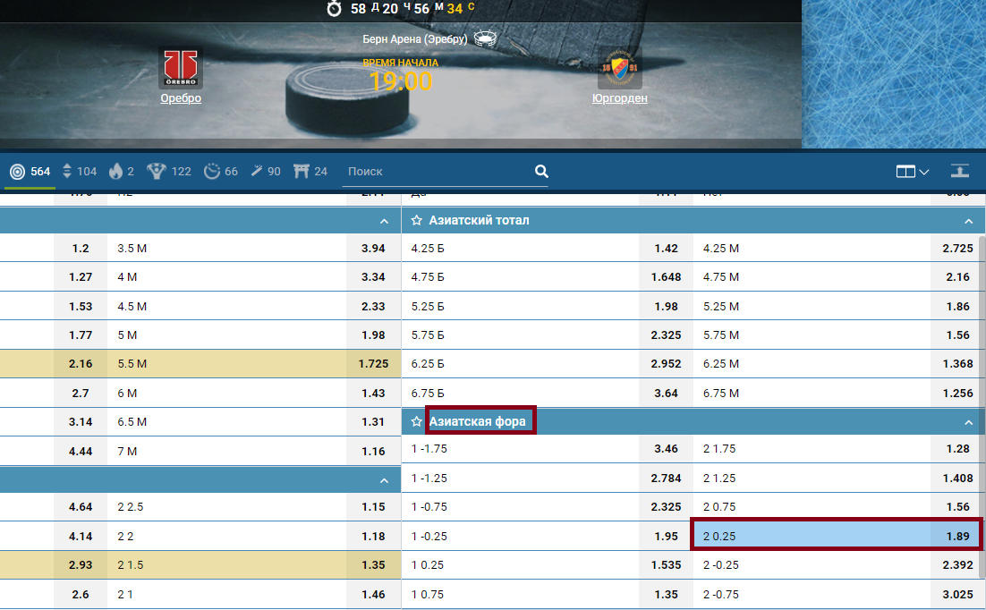 Вот пример азиатской форы в хоккее. Матч между «Оребро» и «Юргорденом», где первая команда — фаворит. А на «Юргорден» можно поставить с форой 2 (+0.25).