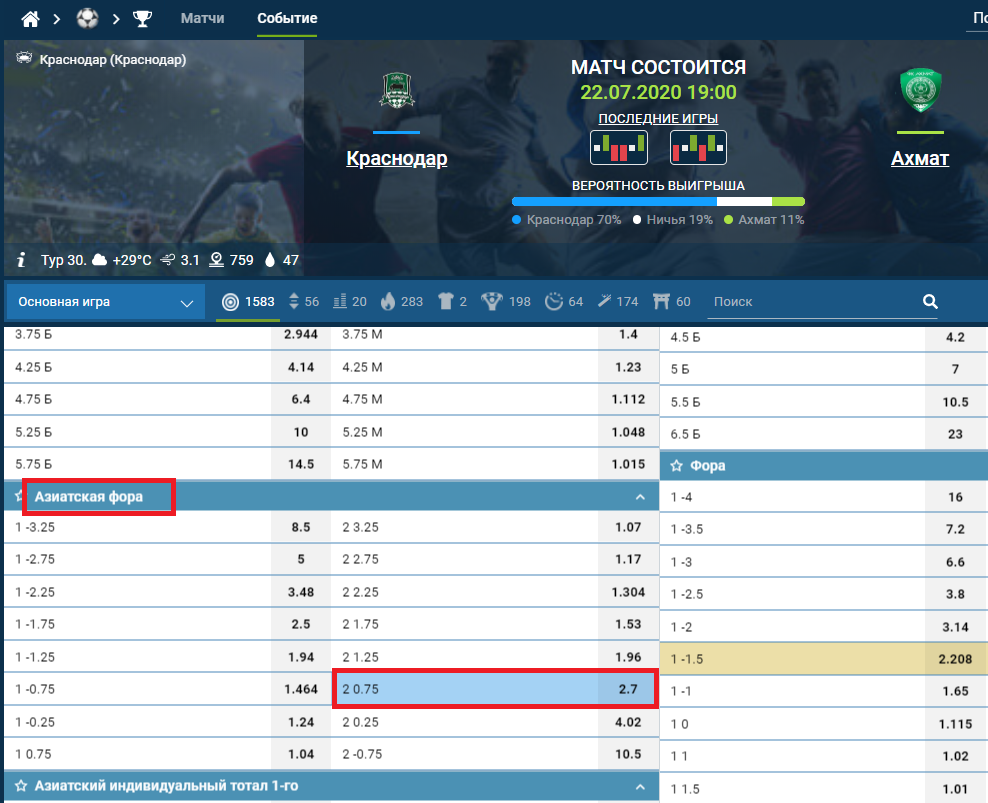 Рассмотрим, как работает азиатская фора, на примере футбольного матча между командами «Краснодар» и «Ахмат».