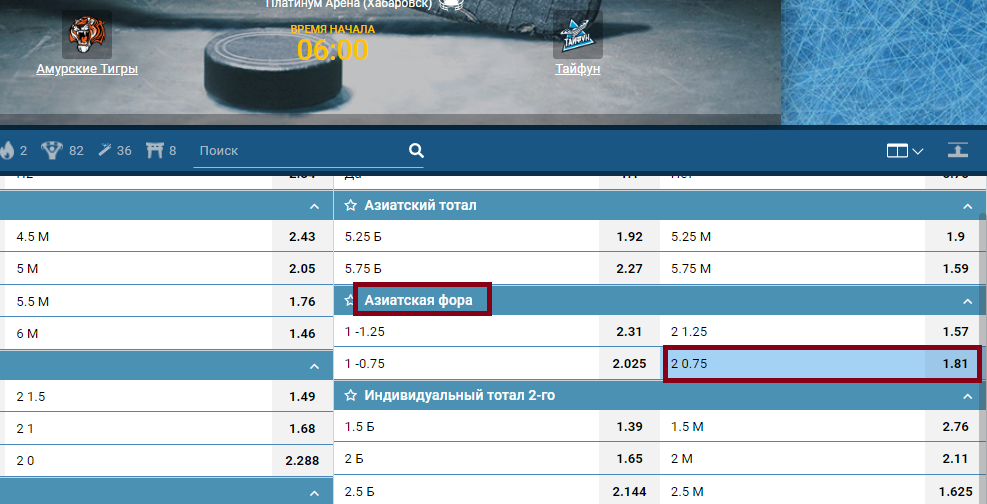 Вот пример азиатской форы в хоккее. Матч между «Амурскими Тиграми» и «Тайфуном», где первая команда — фаворит. А на «Тайфун» можно поставить фору 2 (+0.75), надеясь, что данный коллектив сумеет побороться за победу или зацепится за ничью.