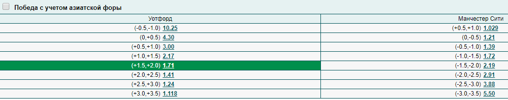 Рассмотрим еще один пример для ставки Ф1(+1.75). Это матч между командами «Уотфорд» и «Манчестер Сити», где первая команда — явный аутсайдер. На «Уотфорд» можно поставить Ф1(+1.75), надеясь, что он не уступит экс-чемпиону английской Премьер-лиги с разницей в два мяча и больше.