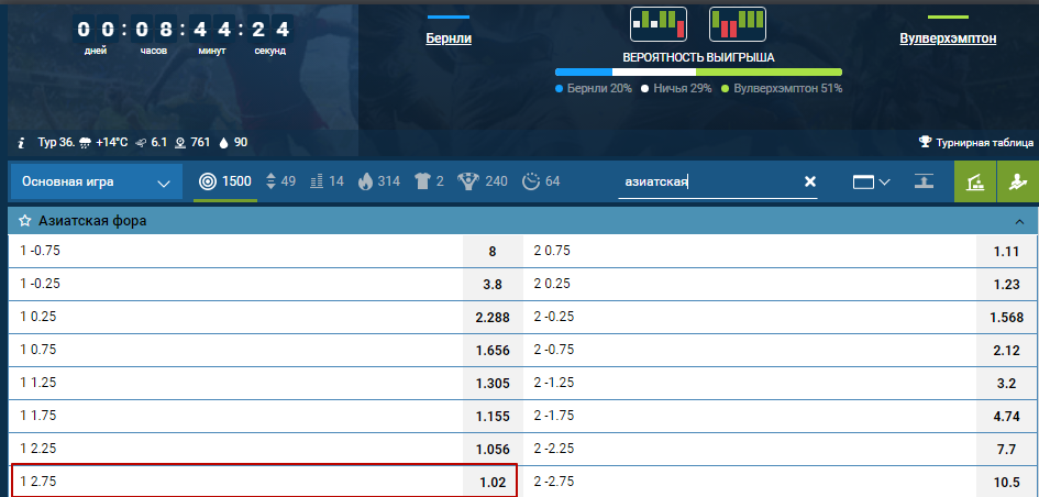 2.75 — значение форы, именно оно указывает на то, что это азиатская фора. Что оно значит для учета пари, мы разберем ниже.