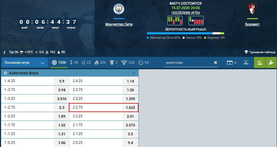 Рассмотрим еще один пример для ставки Ф2(+2.75). Это матч между «Манчестер Сити» и «Борнмутом», где первая команда — фаворит. А на «Борнмут» можно поставить Ф2(+2.75), надеясь, что команда не уступит одному из лидеров АПЛ больше трех голов.