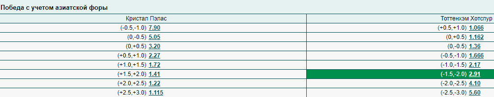 Рассмотрим еще один пример для ставки Ф2(-1.75). Это матч между «Кристал Пэлас» и «Тоттенхэмом», где первая команда — аутсайдер. На «Тоттенхэм» можно поставить Ф2(-1.75), надеясь, что гостевая команда сыграет выше своих возможностей и сумеет разгромить соперника.