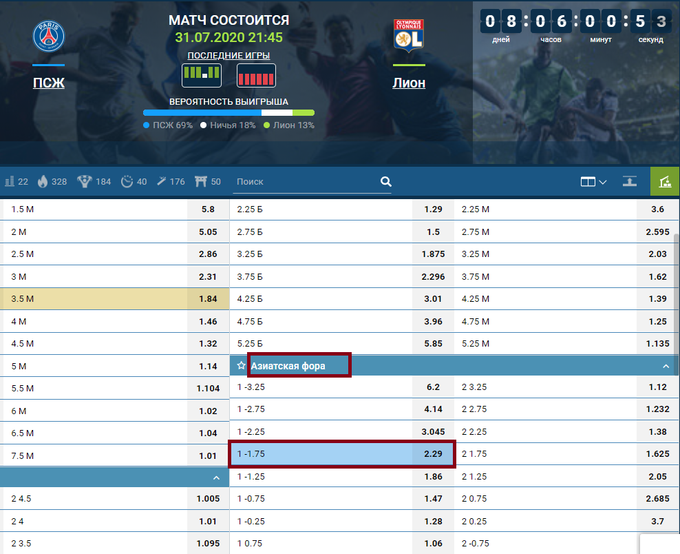 Рассмотрим, как работает азиатская фора, на примере футбольного матча между командами ПСЖ и «Лион».