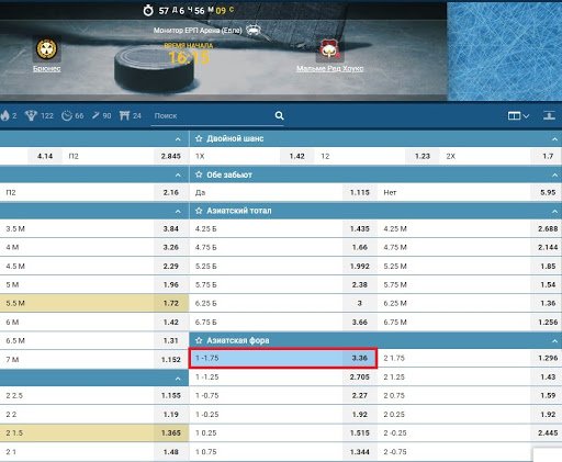 Вот пример азиатской форы в хоккее. Матч между «Брюнесом» и «Мальме», где первая команда — фаворит, на которого можно поставить с форой 1 (-1.75), надеясь, что данный коллектив сумеет одержать победу с разницей в три и более шайбы.