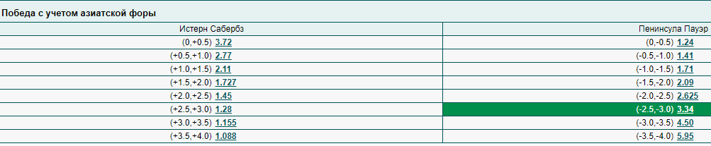 Рассмотрим еще один пример для ставки Ф2(-2.75). Это матч между «Истерн Сабербз» и «Пенинсула Пауэр», где первая команда — аутсайдер. На «Пенинсула Пауэр» можно поставить Ф2(-2.75), надеясь, что гостевая команда сыграет выше своих возможностей и сумеет разгромить соперника.