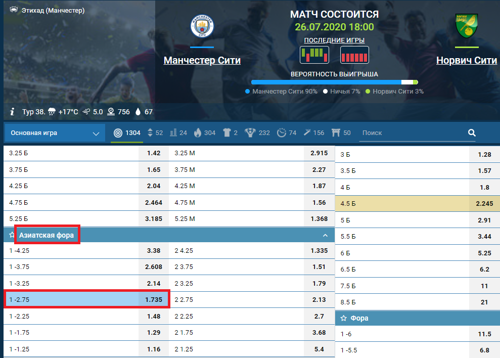 Рассмотрим, как работает азиатская фора, на примере футбольного матча между командами «Манчестер Сити» и «Норвич Сити».