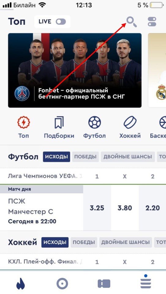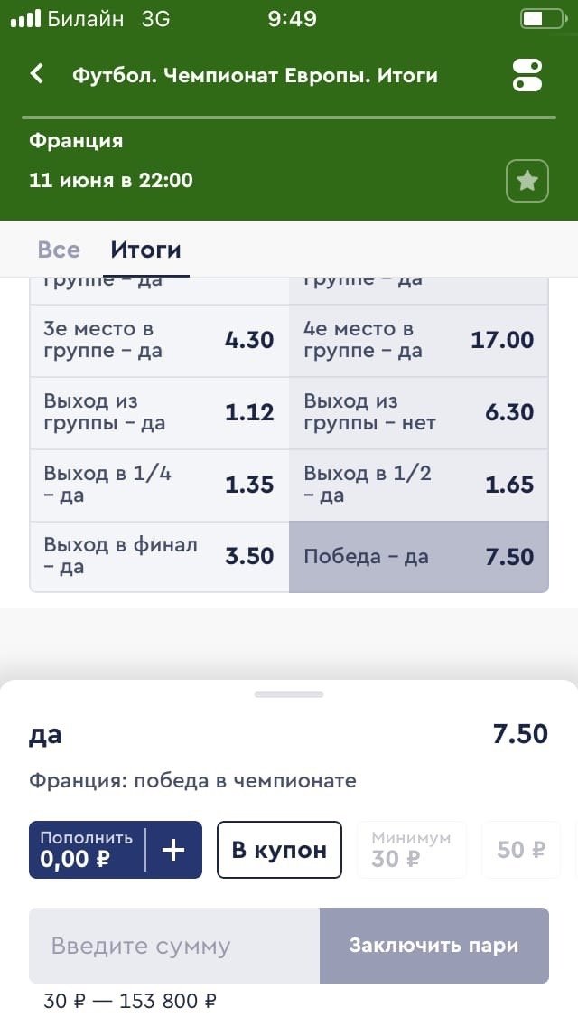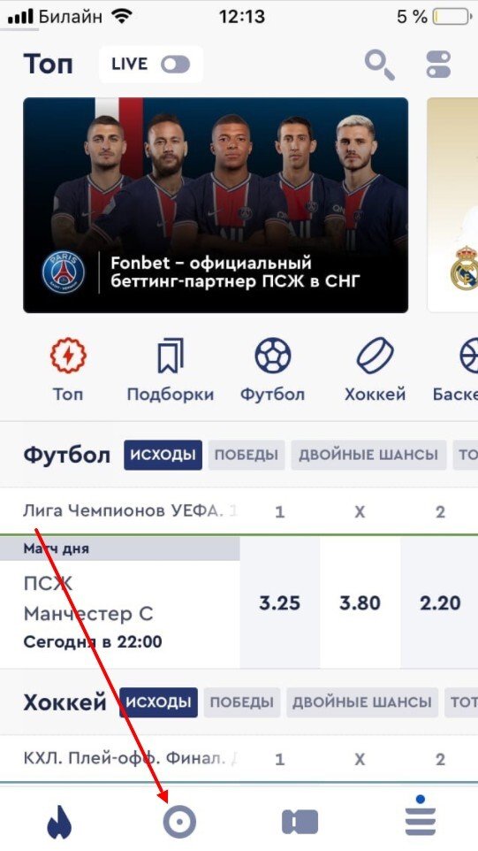 В качестве примера расскажем, как сделать ставку на финал ЧЕ в «Фонбет» в приложении букмекера: