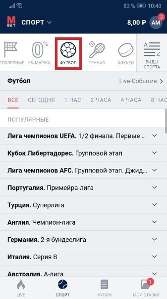 Зайдите в раздел «Спорт» и выберите вид спорта «Футбол».