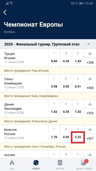На Евро сборная России попала в группу B, где сыграет с командами Бельгии, Финляндии и Дании. Среди ставок и коэффициентов на чемпионат Европы по футболу 2021 (2020) в БК «Марафон» есть котировки на победителя группы B. Букмекер отдает предпочтение бельгийцам (1.64), Дания — на втором месте (3.50), Россия — третья (6.00). Явный аутсайдер нашей группы — сборная Финляндии, коэффициент на выход этой команды с первого места — 20.50.