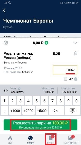 Для одиночного пари во всплывающем окне «Купон» введите сумму ставки и нажмите кнопку «Разместить пари».