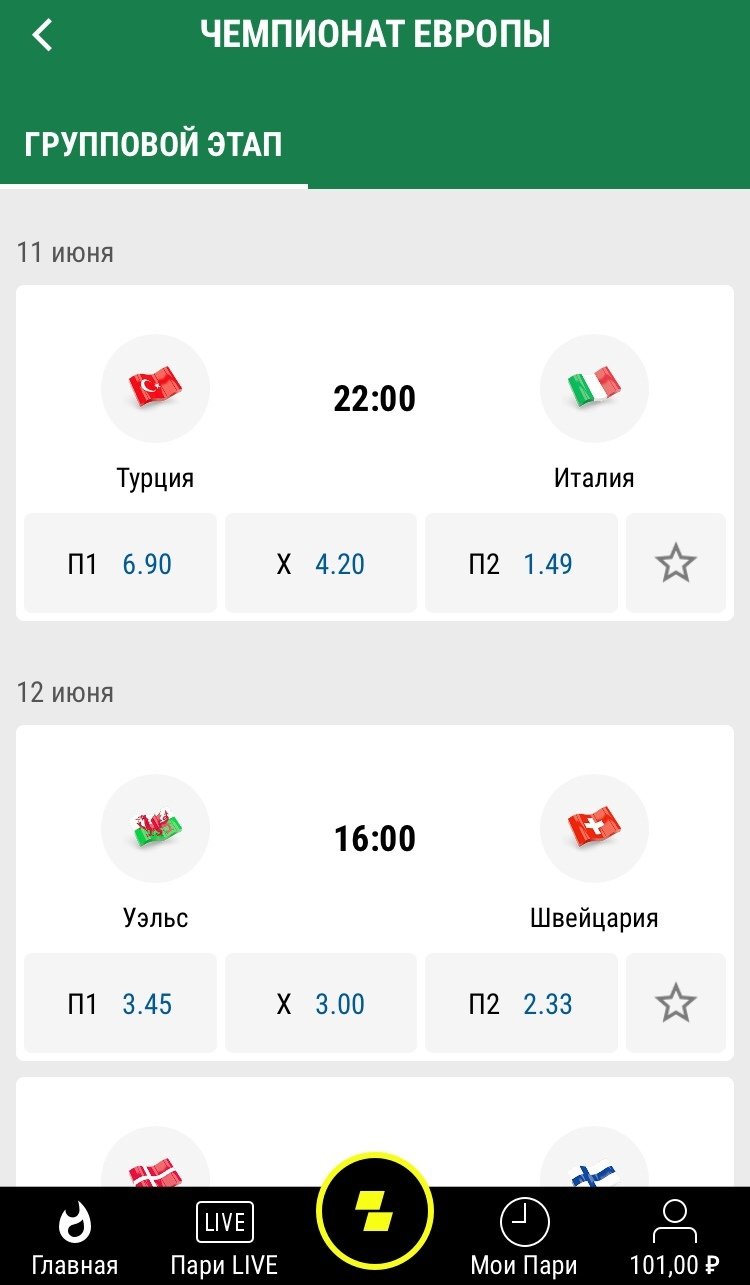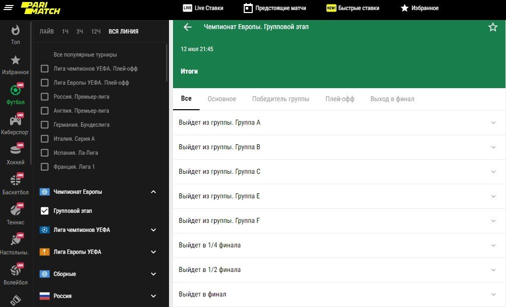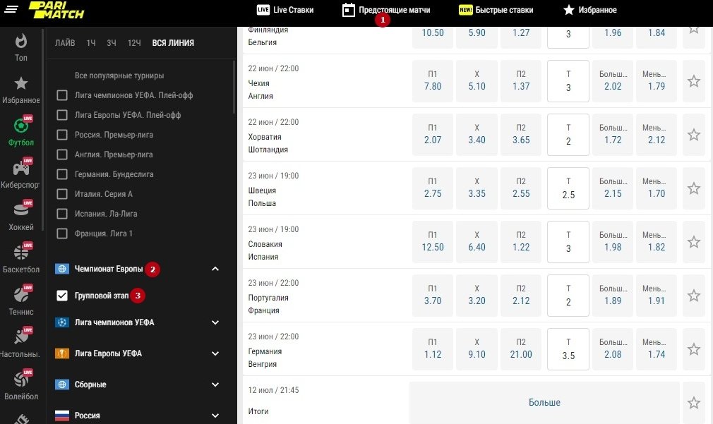 Чтобы найти все предложения, зайдите на официальный сайт parimatch.ru и откройте раздел «Предстоящие матчи». Далее — «Чемпионат Европы» > «Групповой этап». Вверху открывшегося списка — встречи группового этапа. Число коэффициентов на матчи ЕВРО переваливает за 150.