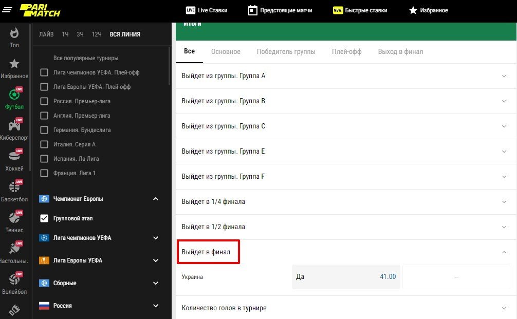 Коэффициент на выход россиян из группы — 1.45. Котировок на выход в различные стадии плей-офф у Parimatch нет, но ближе к старту ЧЕ они могут появиться. Выигрыш Россией чемпионата Европы выставлен астрономической котировкой 81.
