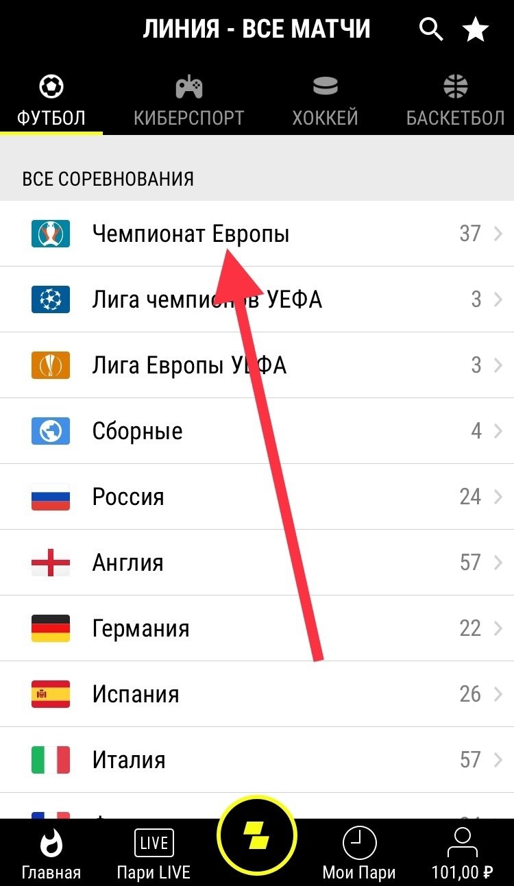 Выберите «Линия – все матчи», а далее — «Чемпионат Европы».