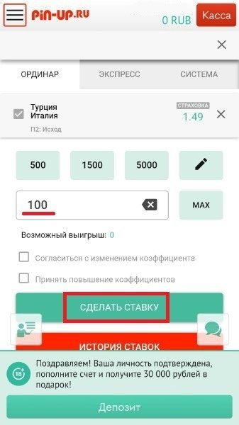 Для ставки типа ординар в открывшемся окне введите сумму и нажмите кнопку «Сделать ставку».