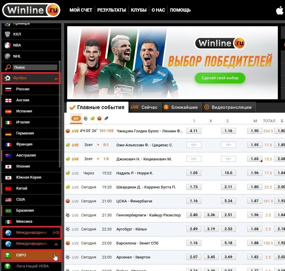 Чтобы найти ставки на футбол чемпионат Европы 2021 (2020) в БК «Винлайн», откройте раздел «Футбол» в линии букмекера. Далее нужно зайти на вкладку «Международные» и выбрать строку «ЕВРО». Компания представила котировки на будущего чемпиона Европы и на победителей каждой из шести групп на ЧЕ-2021. Коэффициентов на матчи Евро в БК «Винлайн» пока нет.