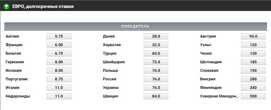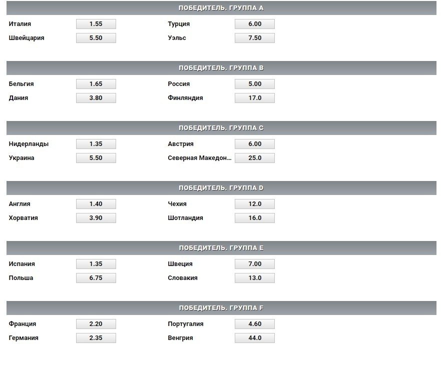 В линии букмекерской конторы «Винлайн» присутствуют ставки на победителей группового этапа Евро-2020 (2021) и на чемпиона Европы.