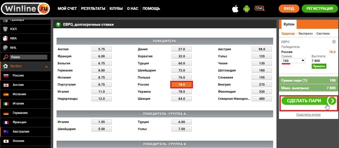 Как сделать ставку на чемпионат Европы по футболу 2021 (2020) в БК «Винлайн»