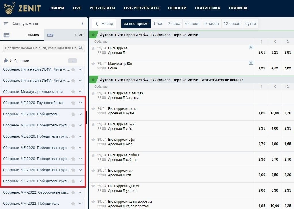 Чтобы найти ставки и коэффициенты на чемпионат Европы по футболу 2021 (2020) в БК «Зенит», зайдите в раздел «Футбол» в линии букмекера. Коэффициенты на матчи Евро «Зенит» разместил на вкладках «Сборные. ЧЕ-2020».