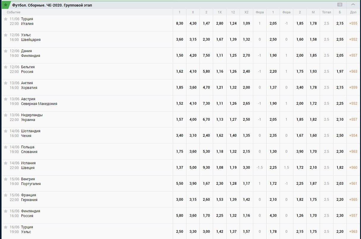 котировки на все матчи группового этапа Евро-2020 и долгосрочные варианты;