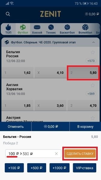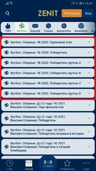 Рассмотрим, как поставить ставку на Евро-2021 (2020) в БК «Зенит» на Андроид-смартфоне:
