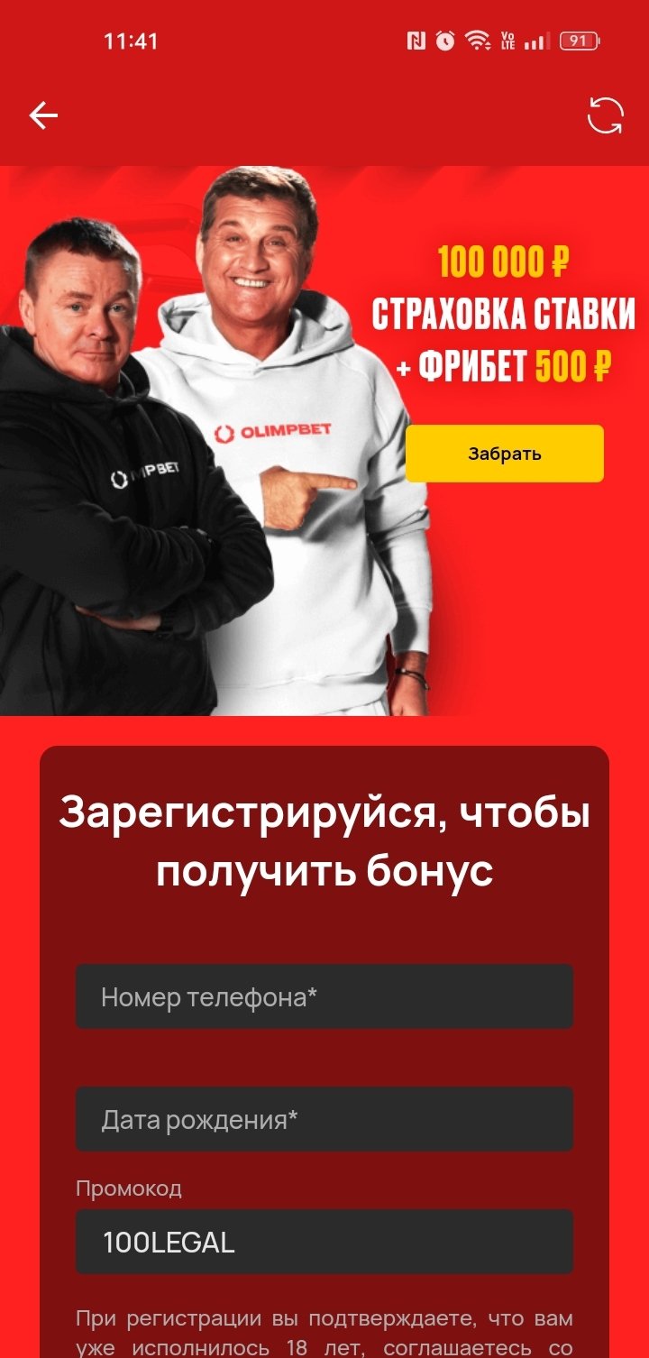 3. Страховка первой ставки. Букмекерская контора обязуется компенсировать убытки клиентов при проигрыше стартового пари. Возврат производится в виде фрибета. Обычно его номинал равен первой ставке, но не более определённой суммы. Если начальное пари сыграет, БК не даст фрибет. Подобная акция есть у «Олимпбета». По ней пользователь сможет вернуть до 100 000 рублей от проигранного пари.