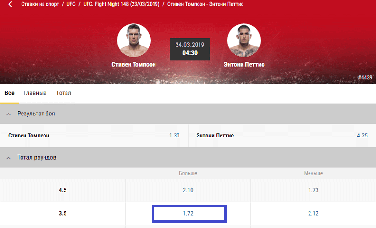 Стивен Томпсон — аккуратный боец, его последние 5 поединков дошли до решения судей, поэтому в этом противостоянии сделана ставка в размере 400 рублей с учетом ТБ 3.5 по раундам с коэффициентом 1.72.