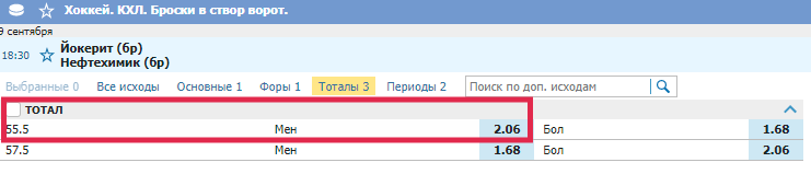 В росписи на хоккей тоже есть уникальные тоталы. В линии предложены ставки на штрафное время, количество бросков, силовых приемов или число выигранных вбрасываний.