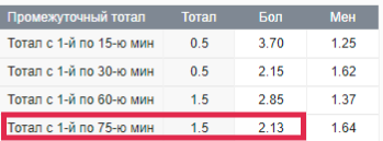 Букмекер котирует ставку на тотал с 1-й по 75-ю минуты с коэффициентом 2.13. Разберем возможные исходы:
