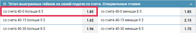 Для примера рассмотрим матч, где была сделана ставка в размере 500 рублей на «тотал больше 8.5 выигранных геймов на своей подаче со счета 40-0».