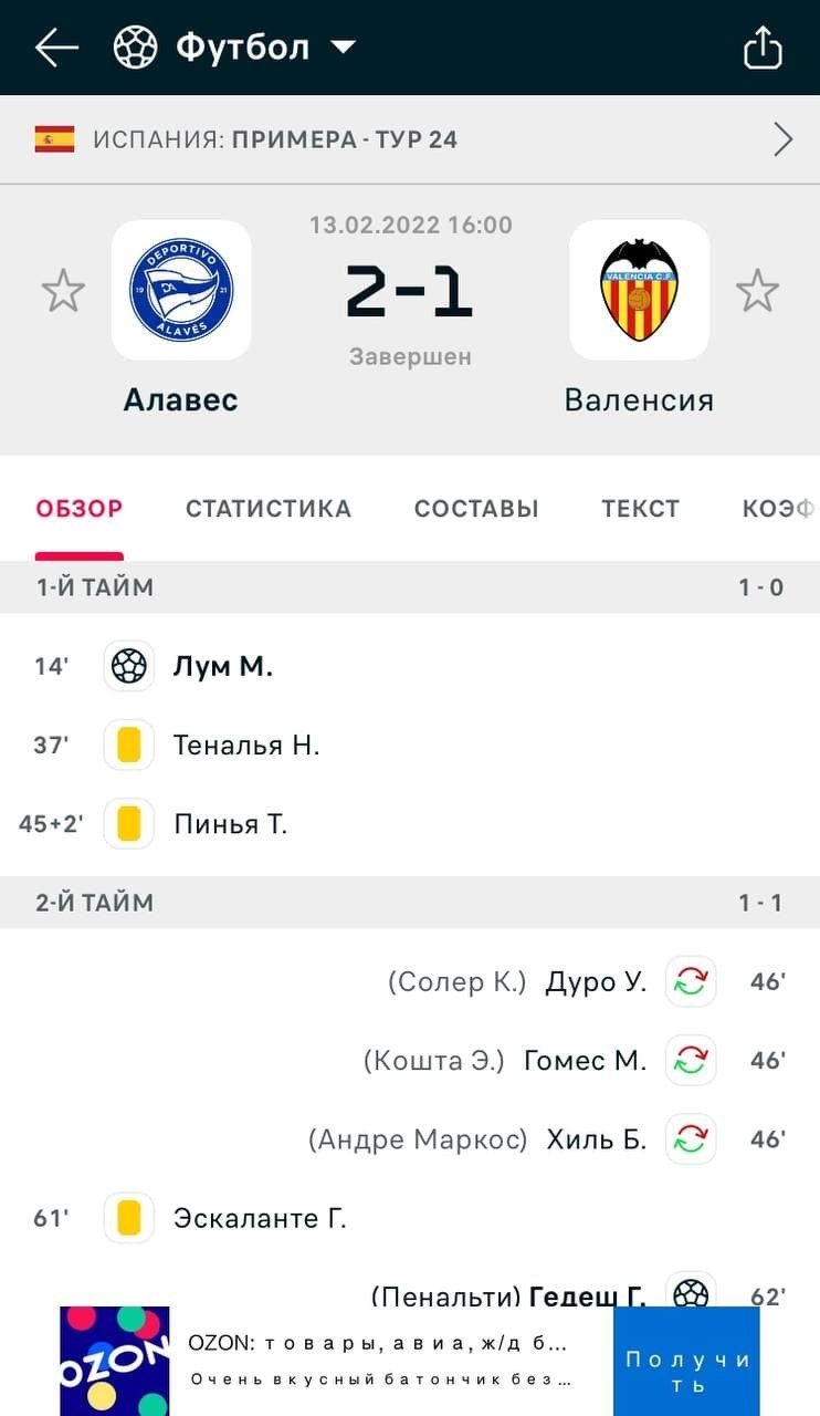 Содержание главной страницы матча отличается в зависимости от вида спорта. Для футбольного матча вы найдёте разделы: «Обзор», «Статистика», «Составы», «Текст». Для баскетбола — «Обзор матча» «Статистика игроков», «Статистика», «Составы», «Ход матча».