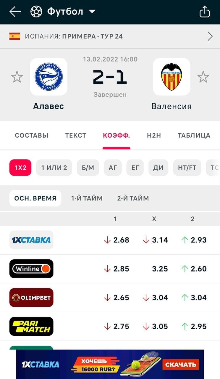 Коэффициенты. Предматчевые предложения букмекеров на основные рынки по матчу или его отрезку: 1Х2, 1 или 2, больше/меньше, азиатский гандикап, европейский гандикап (фора), двойной исход (двойной шанс), HT/FT, точный счёт, чет/нечёт, обе забьют. Легко понять, в какой конторе ставить выгоднее. Коэффициенты сохраняются в архиве, причём отдельно для разных отрезков матча.
