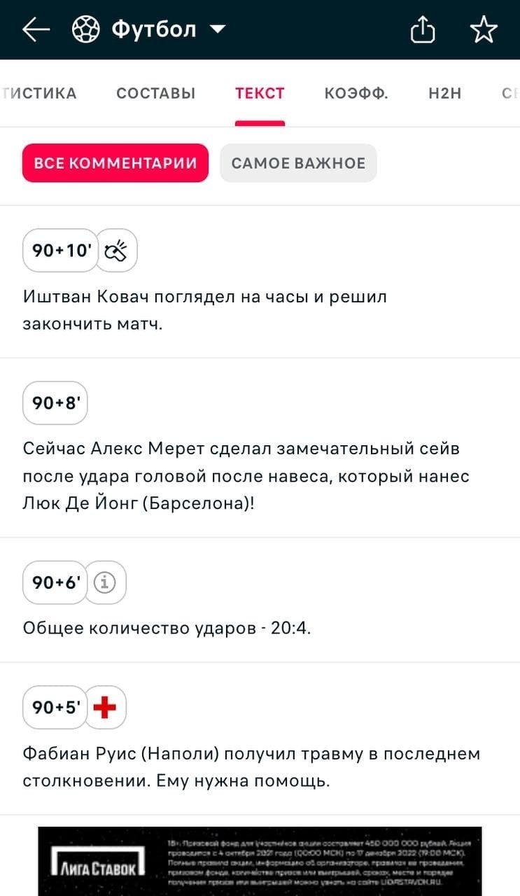 Текст. Текстовые комментарии с указанием событий на каждой минуте встречи. Они разбиты на колонки «Самое важное» и «Все комментарии». Чтение текстовой трансляции — быстрый способ узнать, как играла команда.