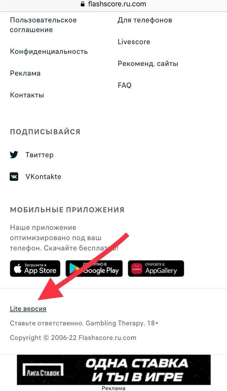 Нередко из-за низкой скорости интернета или внутренних ошибок сайт плохо загружается. Тут вам поможет облегчённаяОна же мобильная. версия по адресу m.flashscore.ru. Также ссылку на неё вы найдёте в «подвале» любой страницы.