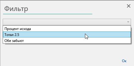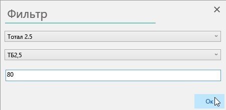 В открывшемся окне выберите тип ставки («Процент исхода», «Тотал 2.5» или «Обе забьют») и процент вероятности прохода ставки (по словам разработчиков, для хорошей выборки нужно вводить значение не меньше 80).