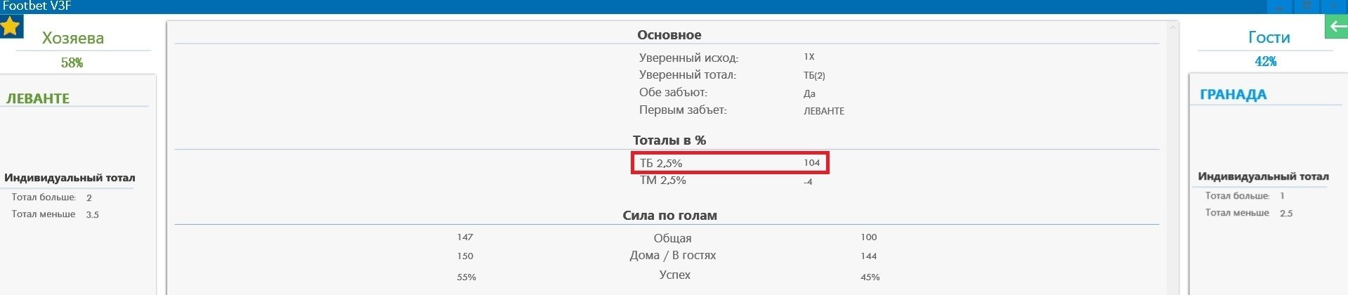 Леванте — Гранада — 2:2. Программа выдала вероятность прохода 104%. Ставка выиграла, кэф — 2.10.