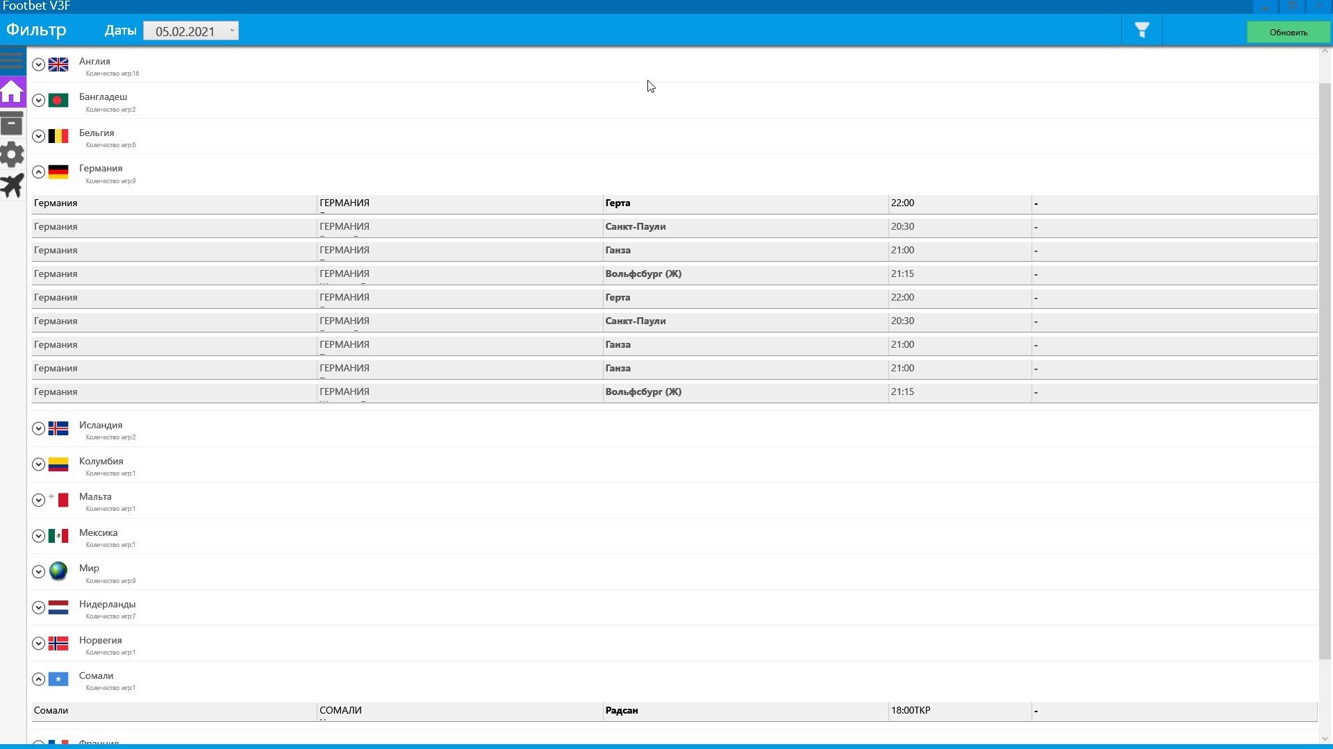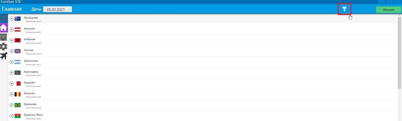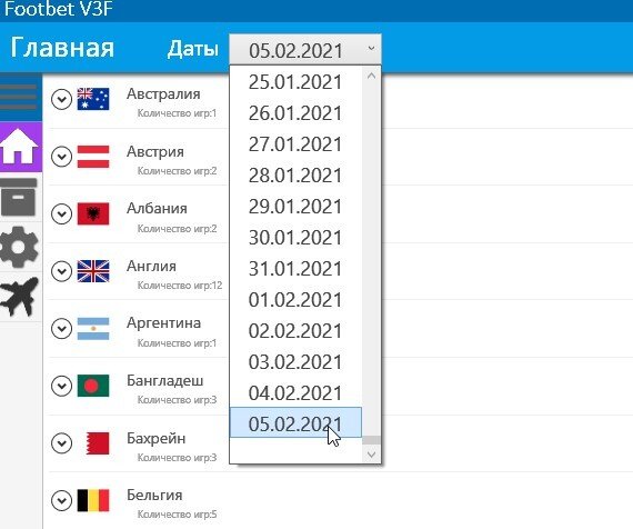 Интерфейс «Футбет» выглядит минималистично, если не сказать сыро. Главная страница — это окно со списком стран, где сегодня проводят футбольные матчи. Рядом указано количество игр. В программе присутствует фильтр по датам, но выбрать можно только текущий день или прошедшие даты. Единственная польза от такого фильтра — возможность проверить точность прогнозов программы.