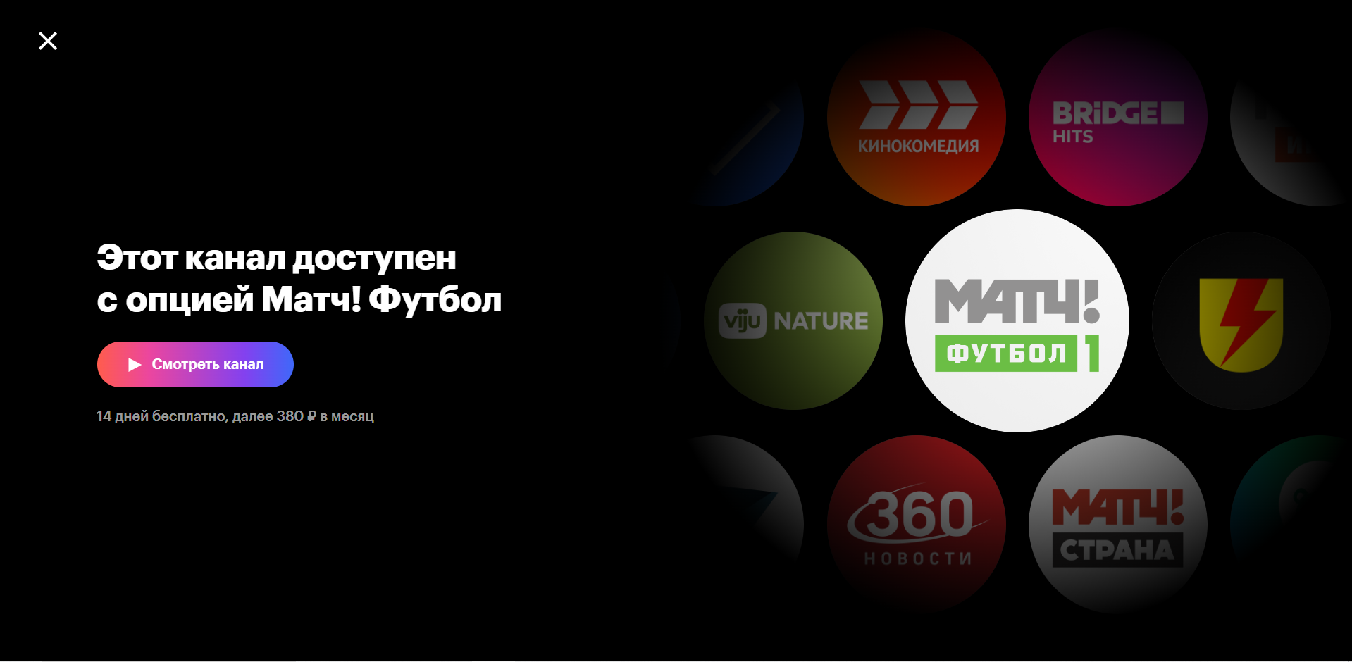 «Матч ТВ» — бесплатно. Футбольные каналы по подпискам от 399 рублей. |