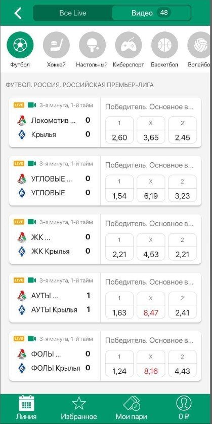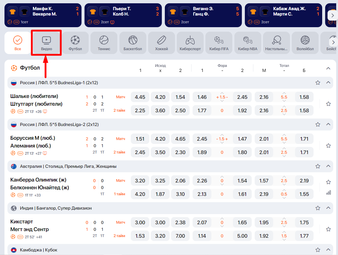 Раздела «Видеотрансляции» на сайте и в приложении нет. Но и на сайте, и в приложении букмекера в разделе Live есть специальный фильтр.