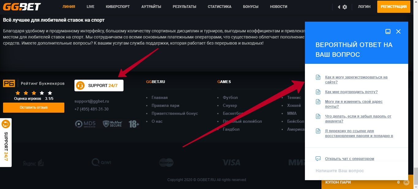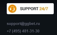 Способы связи с поддержкой (емейл и телефон) указаны в подвале любой из страниц официального сайта ggbet.ru под кнопкой лайв-чата Support 24/7.
