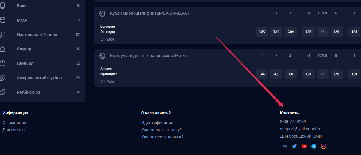 Контактные данные указаны внизу главной страницы сайта Vulkanbet.ru. Здесь же расположены ссылки на аккаунты букмекерской конторы в соцсетях и мессенджерах.