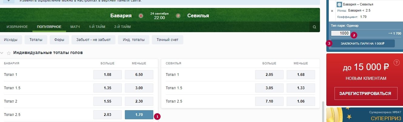 5. Выбираем любой маркет с индивидуальным тоталом, прописываем размер пари и нажимаем «Заключить пари».